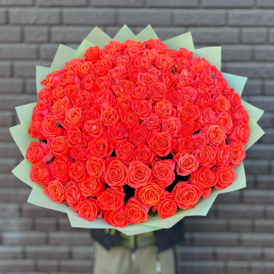 На фото букет из 101 коралловой розы. В составе: роза 101 шт, дизайнерская упаковка 2 шт, атласная лента 1 шт, . Все цветы свежие и ароматные, букет красиво оформлен и отлично подходит для подарка. Доступна доставка цветов или самовывоз.
