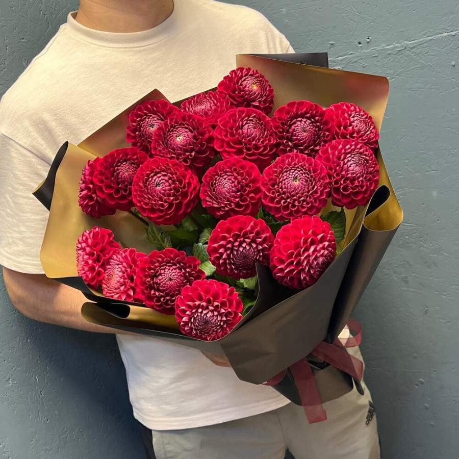 На фото букет из 19 красных георгин. В составе: георгина 19 шт, крафт-бумага 1 шт, атласная лента 1 шт, . Все цветы свежие и ароматные, букет красиво оформлен и отлично подходит для подарка. Доступна доставка цветов или самовывоз.